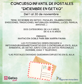 Con motivo de la proximidad de la llegada del invierno y las celebraciones de navidad, situadas durante el mes de diciembre, durante todo el mes se podrá participar en este concurso de postales, que consta de dos categorías: Entre 4 y 9 años Entre 10 y 15 años En ambas categorías el premio serán 2 entradas para BBK Karpín Fauna. El tema de la postal será diciembre en Getxo, por lo que podrán estar ambientadas en navidad, el invierno o cualquier cosa relacionada con el mes elegido. Las postales podrán entregarse en el Aula. Además, podrán enviarse por correo electrónico a la dirección info@ingurumenaretoagetxo.eus (escaneadas o fotografías de las mismas) desde el día 1 de noviembre hasta las 23:59 del 30 de noviembre. Pueden consultarse las bases aquí: CLIC! *Las postales entregadas, estarán expuestas en el centro de recursos del Aula durante el mes de diciembre.