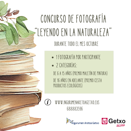 Las personas que quieran participar en este concurso tendrán que enviarnos una fotografía de sí mismas leyendo en algún entorno natural o parque urbano de Getxo. Hay que enviar la fotografía al correo electrónico info@ingurumenaretoagetxo.eus, indicando en el email dónde está sacada la foto y algo que te guste o quieras destacar de esa zona verde, parque o zona natural. Hay dos categorías: de 6 a 15 años y de 16 en adelante. En la primera categoría el premio será un maletín de pintura. En la segunda categoría el premio será una cesta de productos ecológicos. Las fotografías enviadas podrán ser publicadas en las Redes Sociales del Aula Ambiental (Facebook, Twitter o Instagram. No hace falta que se vea la cara, pero sí la zona donde está sacada la fotografía). Las bases del concurso pueden consultarse AQUÍ